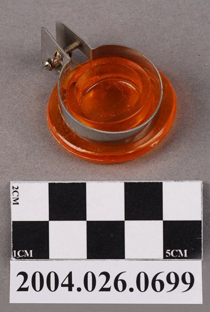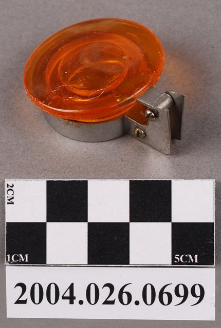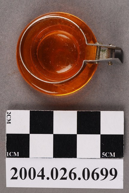 本物件為塑膠蓋,深琥珀色。蓋身有一金屬環狀物,環狀物尾端延伸出L型,有兩顆螺絲在L型金屬上,將金屬環狀物夾住固定於蓋身。
