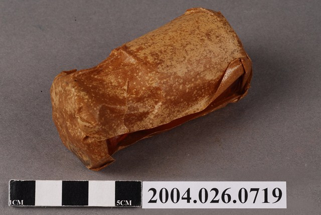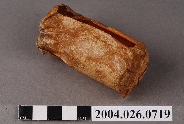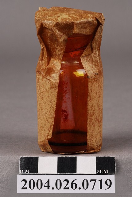 本物件為玻璃瓶,茶色透明玻璃材質。瓶子被淺咖啡色紙包住,露出一部分瓶身。