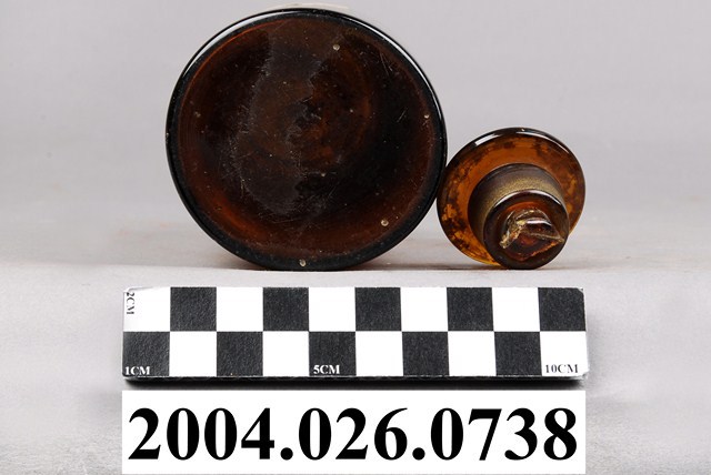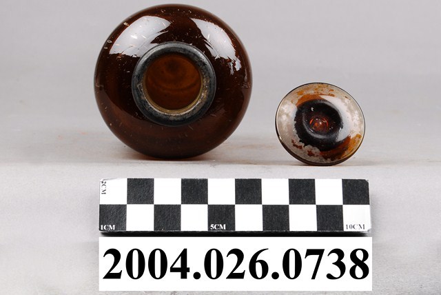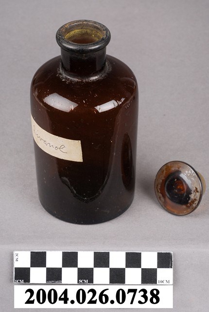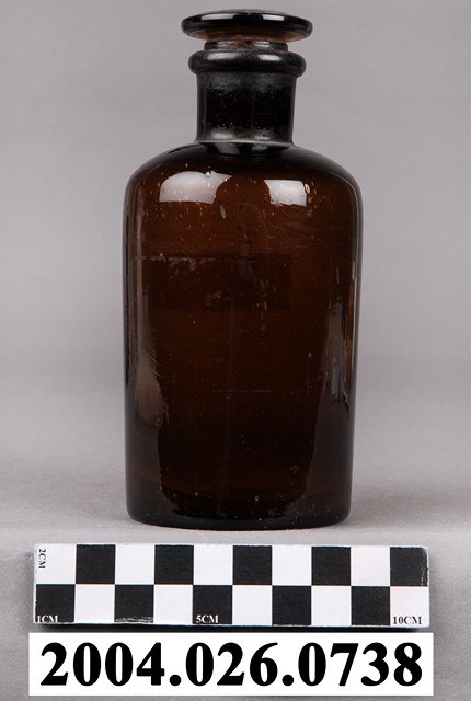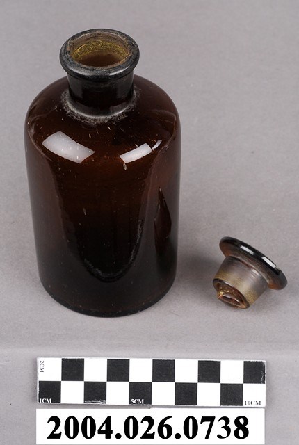 1.本物件為玻璃罐,細口瓶。瓶身與瓶蓋是茶色透明玻璃材質。瓶身與瓶蓋可分開。瓶上貼有一白色標籤,寫有文字Rivanol。 2.Rivanol為黃藥水。
