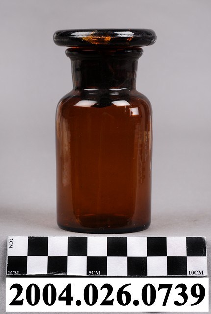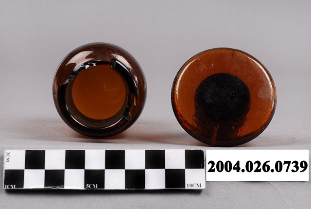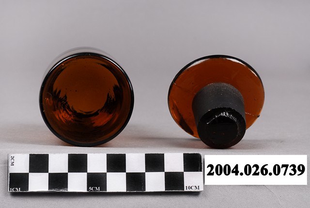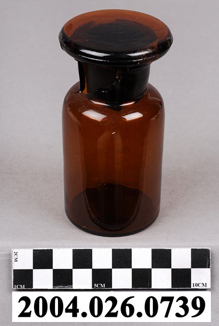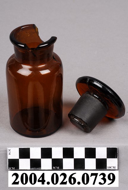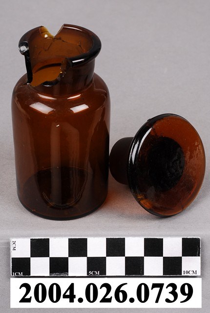 本物件為玻璃罐,細口瓶。瓶身與瓶蓋是茶色透明玻璃材質。瓶口有破損。瓶身與瓶蓋可分開。