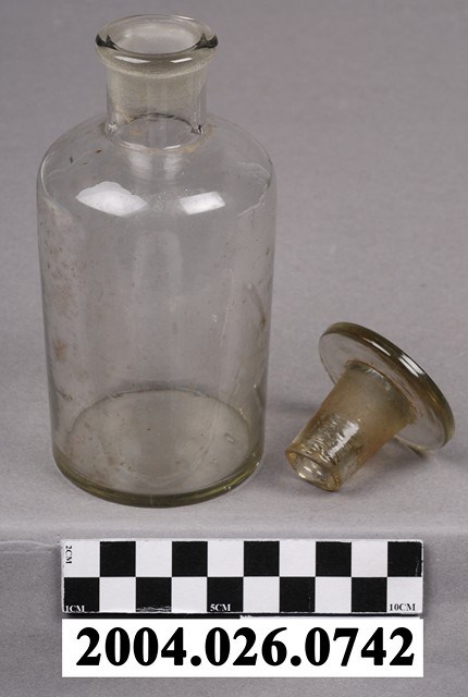 本物件為玻璃罐,細口瓶。瓶身與瓶蓋是無色透明玻璃材質。瓶身與瓶蓋可分開。