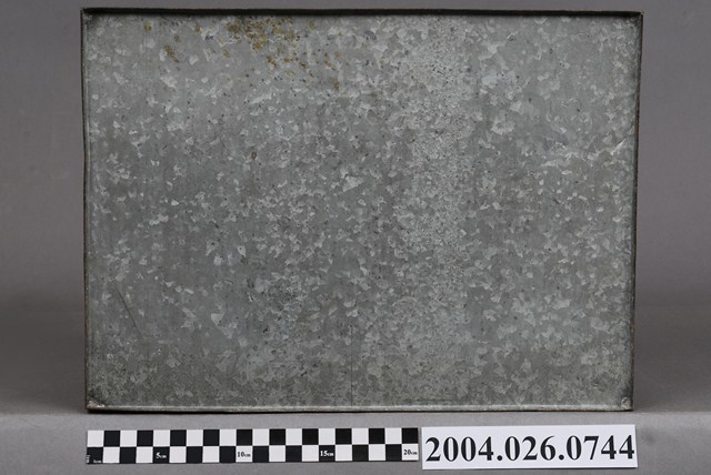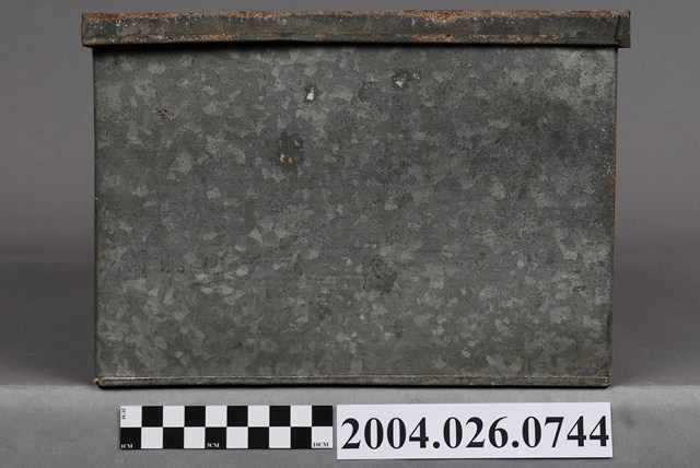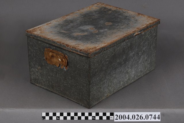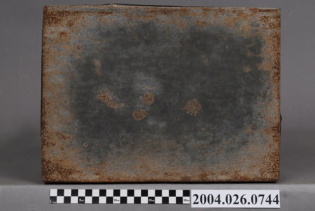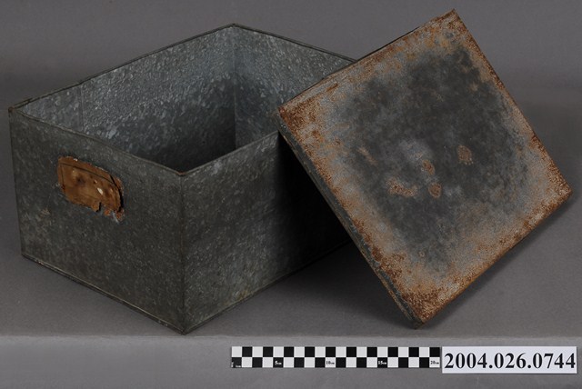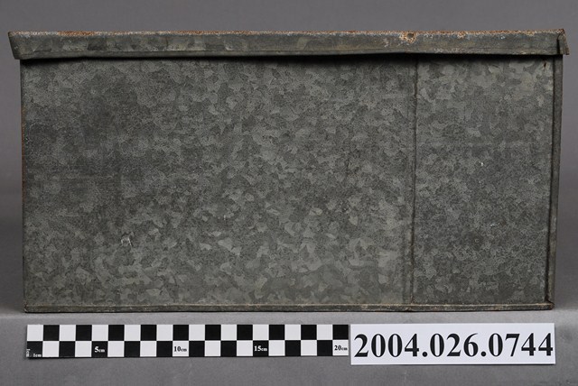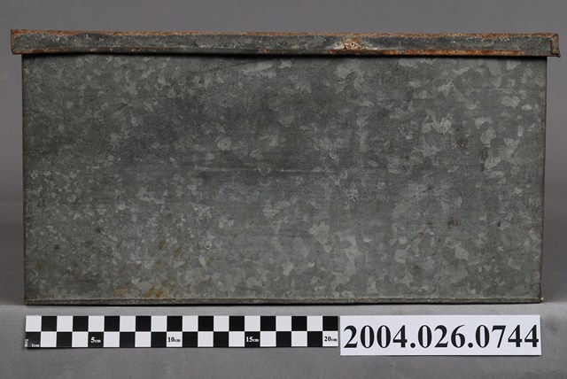 本物件為鐵盒,體積呈長方體。有一蓋子,顏色與盒身相同,應與盒身為同樣材質,蓋子可以完全從盒身上移開。蓋子頂部生鏽較為明顯。有一邊的短邊側面黏有一片物體,其上有框線。