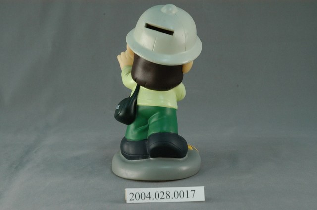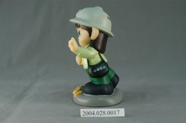 1.本物件為2001年郵政女娃娃。整體構造為一個穿著綠色郵政制服及戴著有郵政符號帽子的長髮娃娃及其底座。娃娃右手上拿著信件、左手肩背著郵政包,包包上印著「中華郵政」;基底部分為灰色,前方印著「2001」的字樣,帽子後方有設置投錢孔,整體為一個存錢筒。