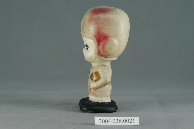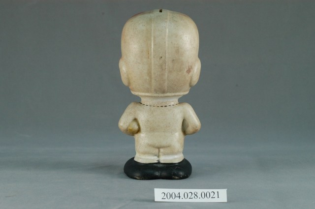 2.大同寶寶是大同公司的企業娃娃,大同公司原為由林尚志與其合夥人共同創立於1918年的協志商號,當時以營造業為主。1939年林尚志成立大同鐵工所,戰後改為大同製鋼機械公司,1968年改名為大同股份有限公司。 1969年大同製鋼機械公司為紀念51年廠慶,製造第一隻大同寶寶,其編號為51,往後每年皆會生產一隻大同寶寶,上面編號即為創廠紀念號。當時很多消費者將大同寶寶當作消費禮物或者電視、冰箱上的裝飾品。其中,原本編號為74號至79號,也就是1992年至1998年的大同寶寶僅有胸前的企業商標,背後並無編號。本物件應為1988年製造。