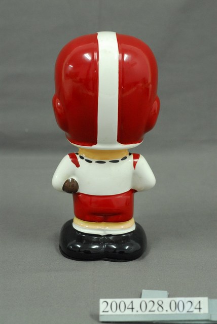 1.本物件為陶瓷製72號大同寶寶,頭上戴著紅白相間的頭盔,印著「大同公司」、「TATUNG CO」等文字和圖案組成的標章,左手抱著橄欖球,右手插腰,運動服裝前面也有金色「72」的字樣,服裝背面則為無邊號。