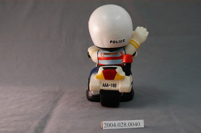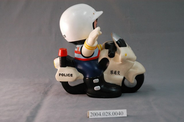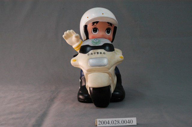 本件為臺南市警察局所發行的公仔,以警員騎警用機車,警用背心上寫交警,機車上寫交通隊,並做揮手致意狀,以此公仔來宣傳交通安全及提升警察局的形象。