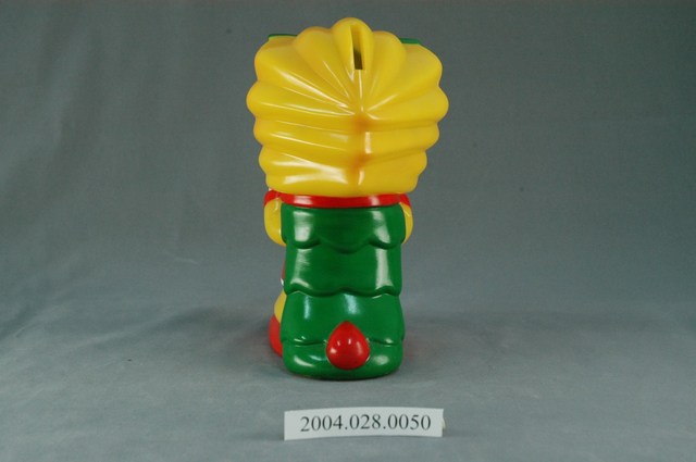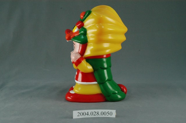 1.本物件為Panasonic舞獅娃娃存錢筒,該娃娃身著紅衣黃褲,整體呈現舞獅的裝扮,紅衣上寫著「Panasonic」、「優質服務」,頭上有開孔可以投入硬幣。