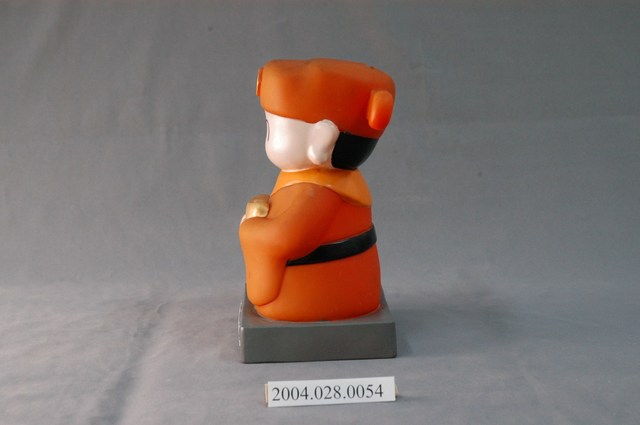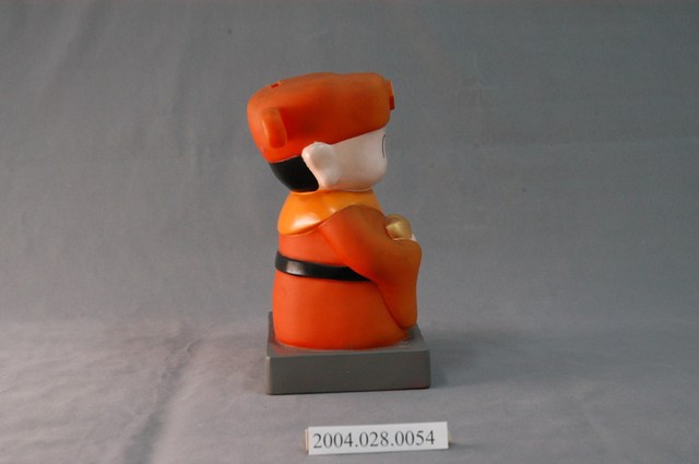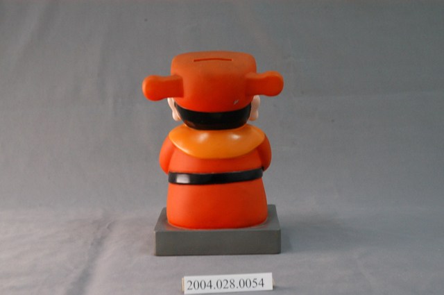 1.本物件是財神爺造型的存錢筒。娃娃雙眼倒U字型瞇眼微笑;頭戴橘黃色帽子,帽子正面有臺灣企銀的黃色商標;身著橘黃色古服繫黑色腰帶;肩上披有橘色披肩;底座正面印有白字「臺灣企銀」。