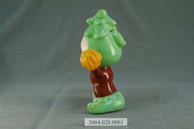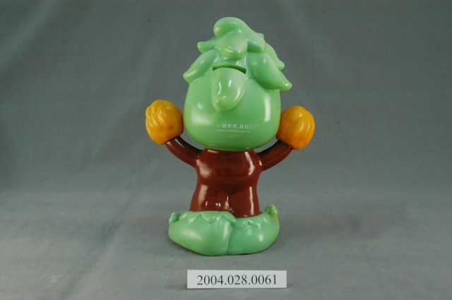 1.本物件是「國泰樹」擬人造型的存錢筒娃娃,頭頂及腳底皆為茂密綠葉造型,身體四肢是褐色樹幹,雙手拳頭似橘色果實。樹娃娃頭頂印有白色英文字母小e圖樣,底下文字「Service」;胸前印有綠色國泰樹商標圖像;背後頭頂印有白字「一路有你,真好!」、「www.cathlife.com.tw」。