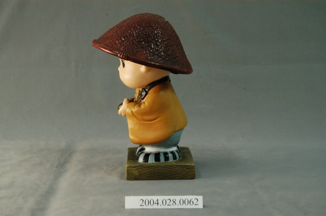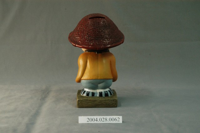 本物件是化緣和尚造型的存錢筒娃娃。娃娃頭戴褐色斗笠,腳穿僧鞋,雙手持有1個化緣缽;娃娃身上著土黃色袈裟,脖子掛有1串佛珠,揹著有白色「卍」字的褐色布袋。