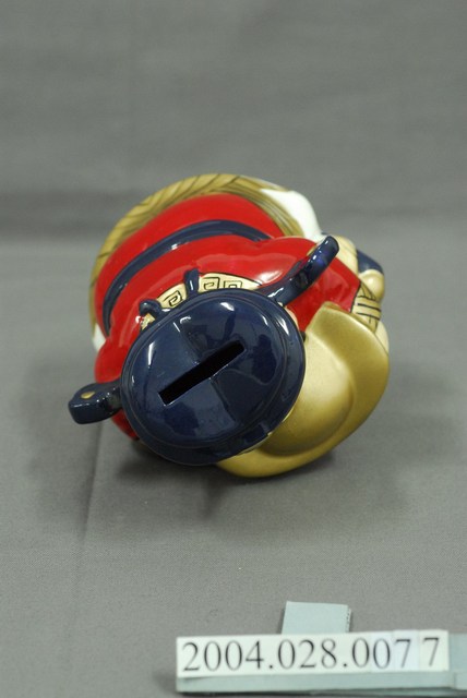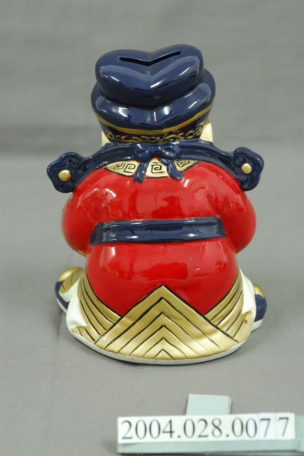 1.本物件是財神爺造型的存錢筒娃娃,娃娃頭戴黑色帽子身著紅色、金色古服,雙手捧1個大金元寶,金元寶正面印有紅底白字「CHB」、紅字「CHANG HWA BANK」、黑字「彰化銀行」。