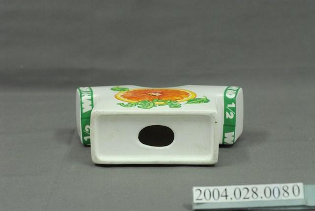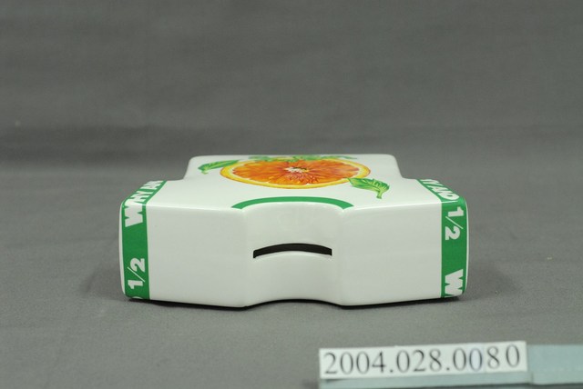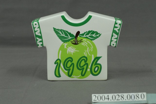 1.此物件為Why&1/2童裝撲滿,為衣服之造型,整體底色為白色,正反兩面圖案不同,正面圖案為1顆剖半的橘子,旁有2片綠葉,並於下方有綠色「Why&1/2」字樣,背面圖案為1顆青蘋果,上有綠色「1996」字樣,兩側衣袖有綠色滾邊,且有白色「WHY AND 1/2」字樣,其物件正上方為1處投幣孔,下方為取錢洞口以黑色物品塞住。