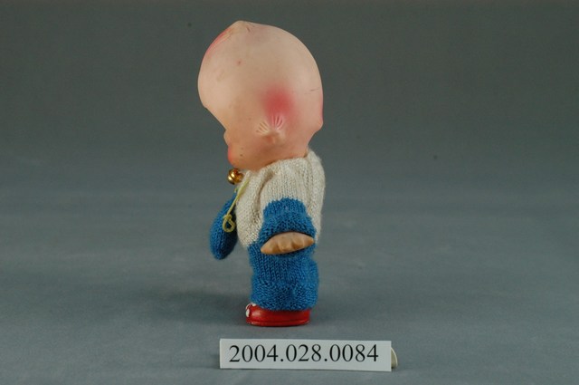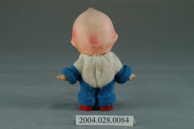 本文物為Q比娃娃,臉部有著長睫毛、藍色大眼睛,頭頂、耳朵兩側以及後腦設有凸出的頭髮樣貌,身上穿著白色、藍色相間的針織毛衣,胸口別著小鈴鐺,脖子掛上小皮包,以及穿著紅色鞋子,娃娃表面有多處的污漬與刮痕。Q比娃娃在1909年由美國插畫家蘿絲•歐尼爾,參考愛神邱比特(Cupid)的樣貌,所繪畫出來,1912年再由德國工廠加以實體化,為Q比娃娃的雛型,由於受到歡迎,1922年日本美奶滋大廠Kewpie公司將Q比娃娃訂為該公司的商標。可從文物得知,Q比娃娃為當時盛行的玩偶物品。