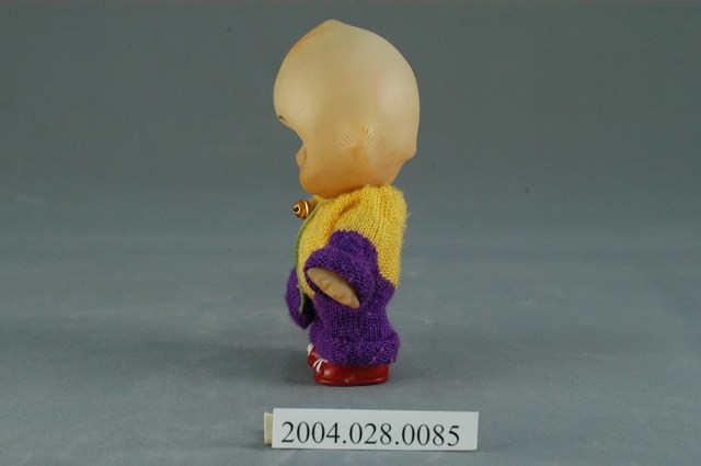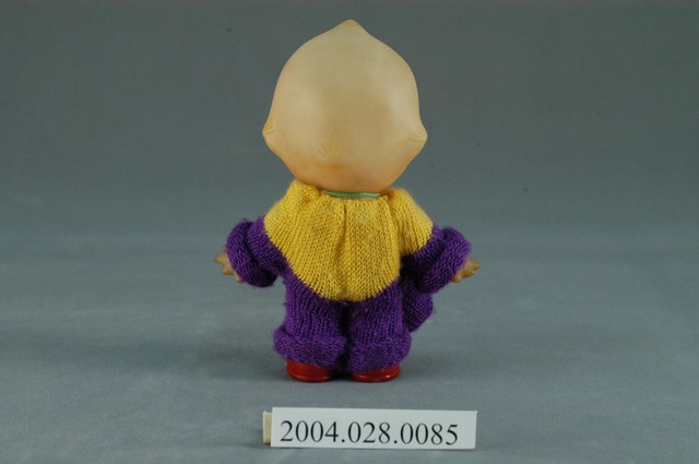 本文物為Q比娃娃,臉部有著長睫毛、藍色大眼睛,頭頂、耳朵兩側以及後腦設有凸出的頭髮樣貌,身上穿著黃色、紫色相間的針織毛衣,胸口別著小鈴鐺,脖子掛上小皮包,以及穿著紅色鞋子,娃娃表面有些許的污漬與刮痕。Q比娃娃在1909年由美國插畫家蘿絲•歐尼爾,參考愛神邱比特(Cupid)的樣貌,所繪畫出來,1912年再由德國工廠加以實體化,為Q比娃娃的雛型,由於受到歡迎,1922年日本美奶滋大廠Kewpie公司將Q比娃娃訂為該公司的商標。可從文物得知,Q比娃娃為當時盛行的玩偶物品。