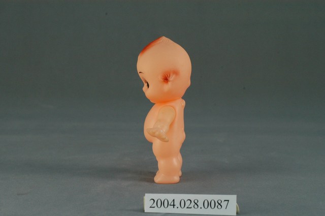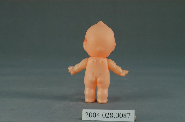 本文物為裸身Q比娃娃,臉部有著長睫毛、藍色大眼睛,頭頂、耳朵兩側以及後腦設有凸出的頭髮樣貌,背後有著一對小翅膀。Q比娃娃在1909年由美國插畫家蘿絲•歐尼爾,參考愛神邱比特(Cupid)的樣貌,所繪畫出來,1912年再由德國工廠加以實體化,為Q比娃娃的雛型,由於受到歡迎,1922年日本美奶滋大廠Kewpie公司將Q比娃娃訂為該公司的商標。可從文物得知,Q比娃娃為當時盛行的玩偶物品。