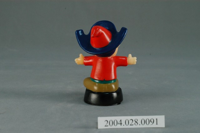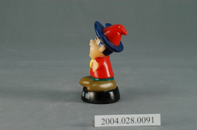 1.此物件為乖乖企業娃娃,為乖乖企業娃娃吉祥物,身穿紅衣,綁有黃色領結,頭戴巫師帽,上紅下深藍,穿土色鞋,兩手往旁伸展,呈類似擁抱姿勢,有2顆招牌大門牙,其底座為黑色,並有白色「乖乖贈」字樣。