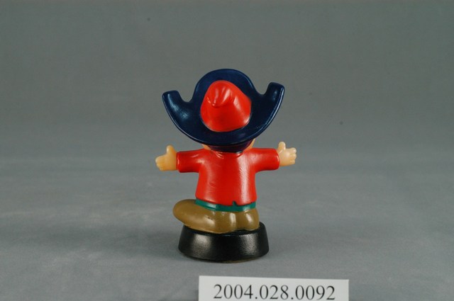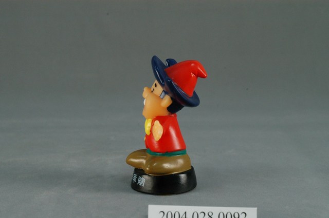 1.此物件為乖乖企業娃娃,為乖乖企業娃娃吉祥物,身穿紅衣,綁有黃色領結,頭戴巫師帽,上紅下深藍,穿土色鞋,兩手往旁伸展,呈類似擁抱姿勢,有2顆招牌大門牙,其底座為黑色,並有白色「乖乖贈」字樣。