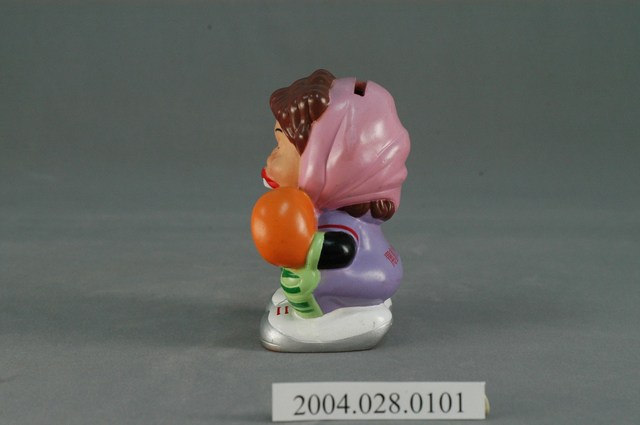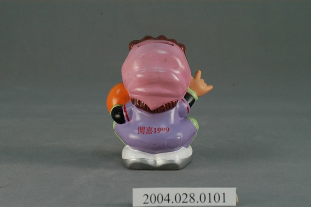 1.此物件為信喜企業開喜品牌娃娃開喜婆婆撲滿,為開喜之品牌吉祥物,呈蹲姿,為1位中年婦人,頭髮為棕色捲髮,外包有頭巾,身穿紫衣,外裝備有著捕手護具,左手戴有捕手手套,右手比出暗號,穿白鞋,背側有紅色「開喜1999」字樣,頭部後側有投錢孔。