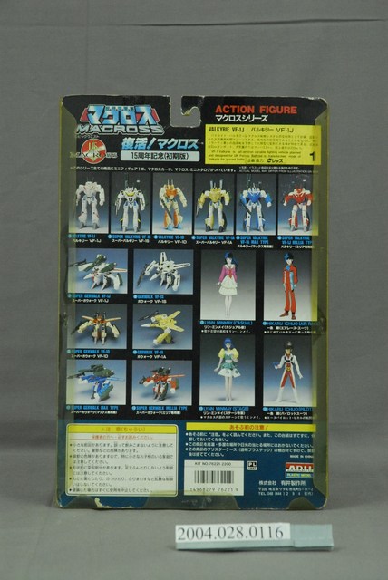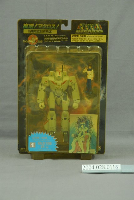 本物件為超時空要塞機器人之模型,塑膠材質。該模型型號為valkyrie vf-1j,包裝完整,尚未拆封,透過包裝左上方可知此物件為「15周年記念(初期版)」,右上方則可見「マクロス」、「MACROSS」、「from the movie "MACROSS DO YOU REMEMBER LOVE"」字樣。其背面為超時空要塞各個角色之圖鑑。