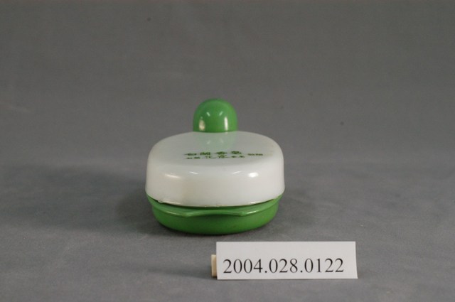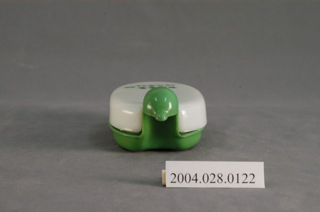 本文物為白蘭香皂盒,白色上蓋印有「白蘭花露香皂敬贈」等文字,底座形狀為綠色小鴨,盒內設有幾個小孔,用於排出香皂上的水滴。1969年白蘭洗衣粉由國聯工業公司(前身為立台化工)推出,在50至60年代,黑人牙膏、黑松汽水以及白蘭洗衣粉,享有「二黑一白」的稱號,可見當時白蘭產品為家喻戶曉重要的民生用品。