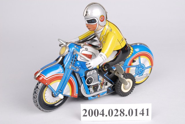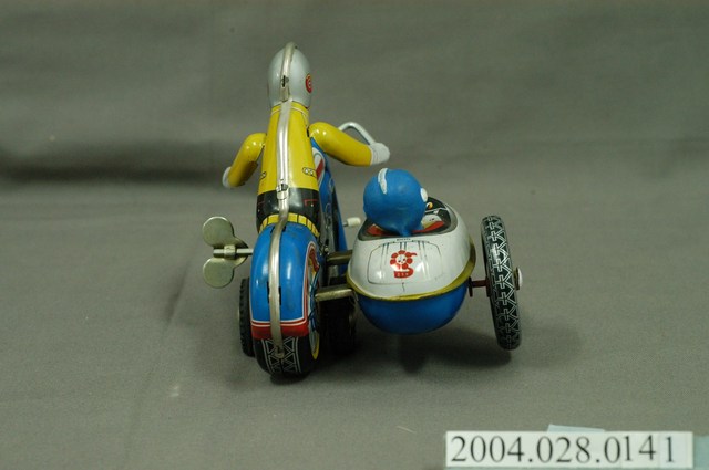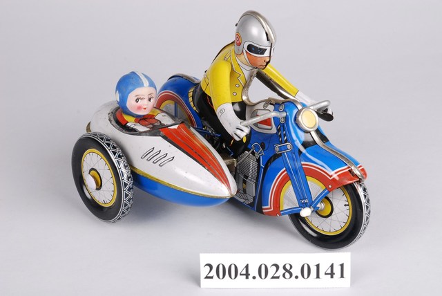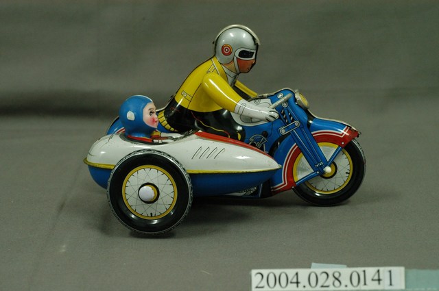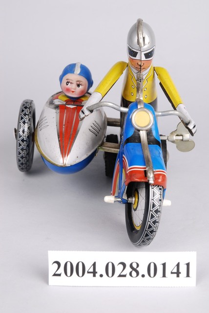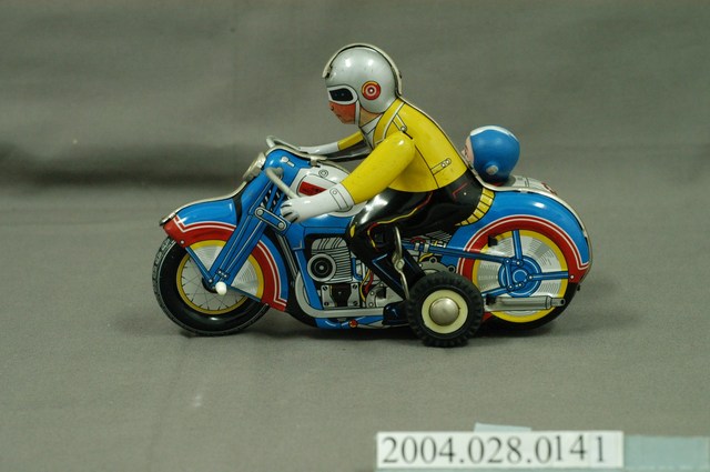 1.本物件為金屬三輪摩托車飛機組合玩具,此物件有一人騎摩托車及一人開飛機,摩托車左邊有一發條,摩托車騎士戴銀色安全帽。 2.臺灣工業社會的來臨各項建設陸續興建,其中交通工具藝快速發展,交通工具成為玩具的題材之一,材質方面從賽璐璐晉升到鐵皮、合金甚至是塑膠。
