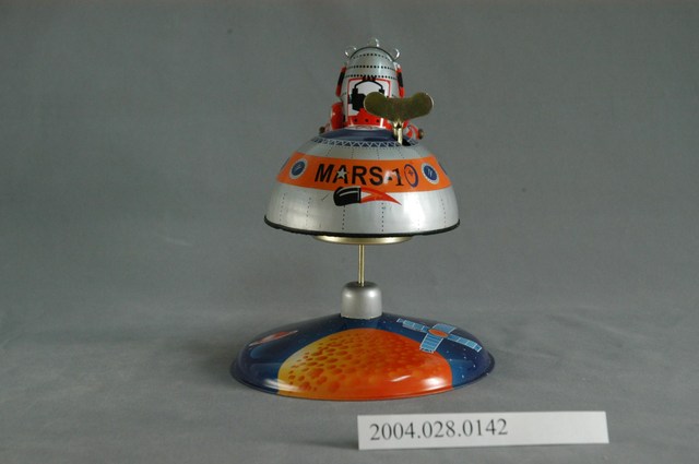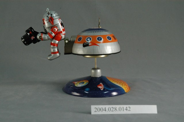 1.本物件為機器娃娃之鐵皮玩具,金屬材質。該鐵皮玩具外觀有1個底座、1個半圓形物件、1個太空人。其底座主要顏色為藍色,外觀繪製如宇宙、行星。半圓形物件主要顏色為銀色,外觀如太空艙。太空人外觀為銀色、紅色,手持1個黑色物品。其背面可見「MARS 10」字樣。