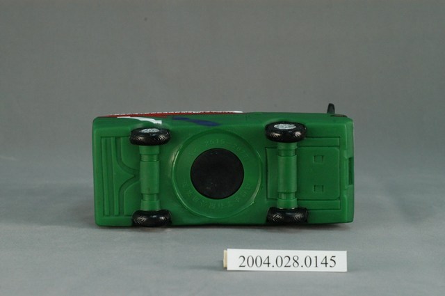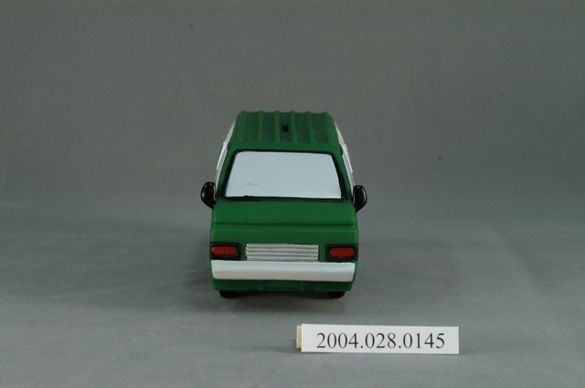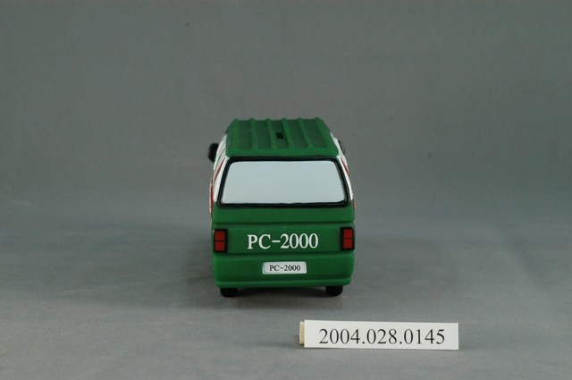 本物件為郵政車,整體構造為整臺綠色的中華郵政車。車子側邊有中華郵政的標誌及「中華郵政」的字樣,旁邊有郵差樣式的貼紙及郵政車的代表色紅色、藍色和白色的裝飾線條,車身後方有印製「PC-2000」的字樣,並且有設置車牌裝飾,車牌上同樣印有「PC-2000」;車頂部分有設置投錢孔,整體為一個存錢筒。