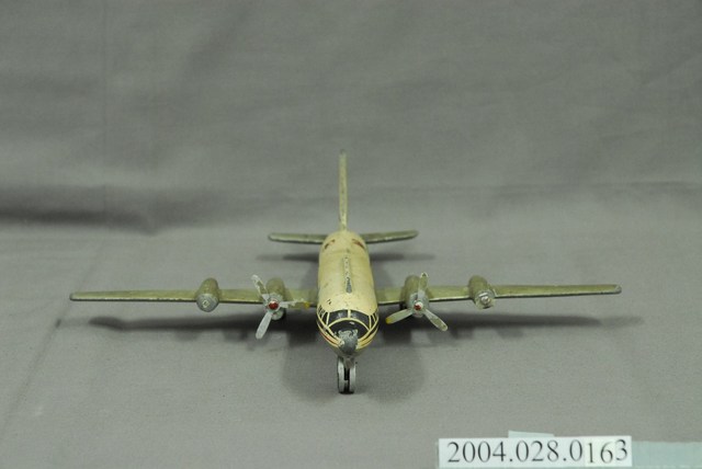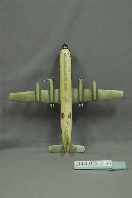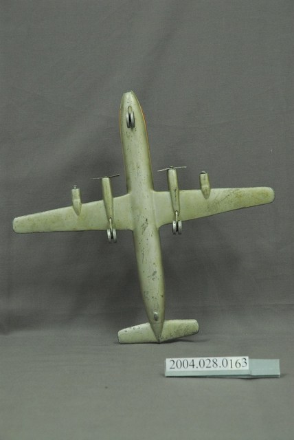 1.本物件為玩具模型飛機。為整體白色的飛機模型,表面已泛黃,機身上有藍、紅條紋裝飾,從機頭一路延伸至尾翼,機頭部分有黑色彩繪的窗格,旁邊有一行英文字「CHINA AIRLINE」,機身中間有兩塊暗紅色的長方形色塊,兩邊機翼上各有一個螺旋槳,機身下面則有三個輪子分佈在機頭、兩翼。
