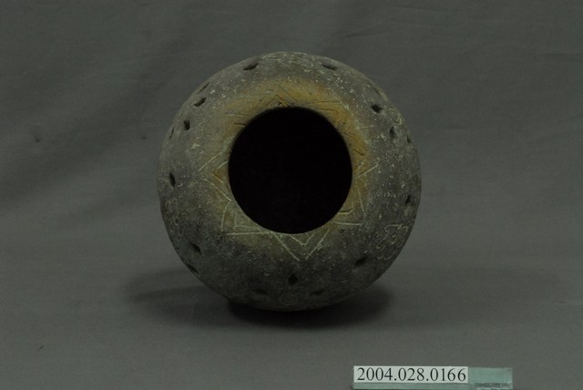 1.本件紅磚胎火缽以紅磚土為坯體燒製而成,表面脫釉嚴重,整體外觀呈現黑灰色澤。其外型作歛口,鼓腹,並於器身中段朝底緣處逐漸收束,底面呈圓形平底。器身上半段以雙層同心圓及花朵紋刻畫在表面,並於圖紋四周作菱形鏤空孔洞。口緣處則以雙層三角紋圍繞口緣處,呈現八角星形作裝飾。2.本件火缽為臺灣早期一般生活所用的火爐,內部可用來裝盛木炭,作為祛寒保暖使用。器身上半部的鏤空孔洞可幫助缽內炭火形成空氣對流,口緣內斂可減少灰燼飛揚。