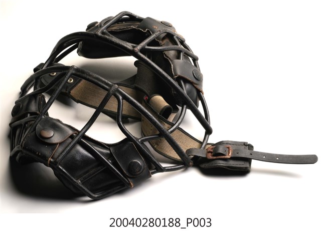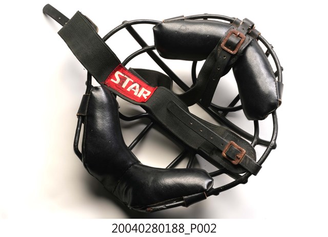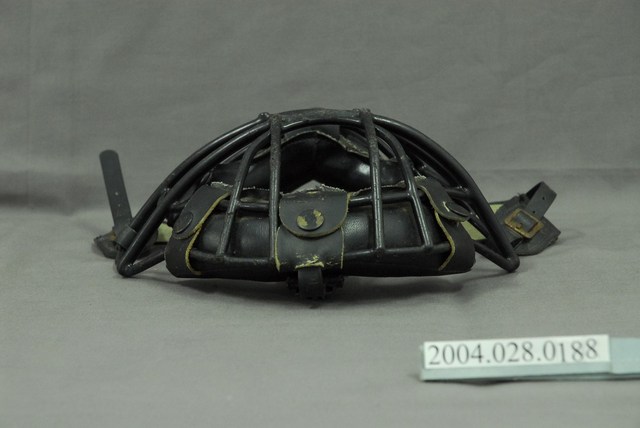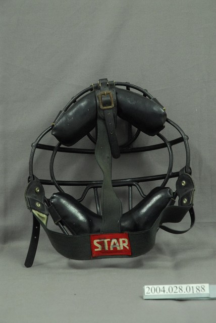 1.本物件棒球捕手面盔,正面由黑色鐵絲連結而成,面罩內上下各有1塊黑色軟墊,面罩背面有一條黑色帶子,連結面罩上、左、右,連接處皆有扣環可調鬆緊,帶子內側為淺綠色,外側有一只布標以紅底白字書寫STAR。