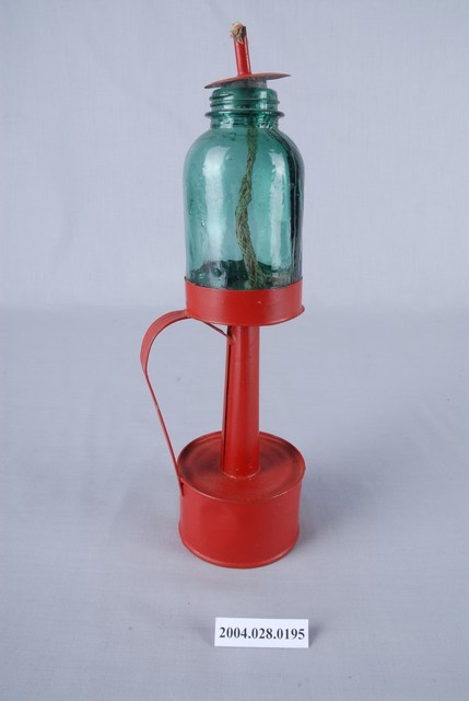1.本件紅漆立柱式煤油燈可分為煤油壺與鐵製燈座2部件,主要以石油提煉之煤油作為燃料,由棉繩燈芯為燃燒媒材使用之燈具。煤油壺使用綠色透明玻璃瓶,其造型呈現短頸,滑肩長直器身,圓形平底。口部上置有圓形鐵片中央處帶有中空管狀,內部固定有棉製燈芯。燈座通身以紅漆裝飾,頂端作圓形承盤固定玻璃煤油瓶,下接管狀立柱,底座利用罐頭,呈圓罐形,另有C形金屬片連接上承盤與下底座設置成手把使用。2.臺灣在電器燈具尚未普及之前,多使用煤油燈具作為夜間室內照明。煤油在臺灣又稱臭油或番仔油,為當時最為經濟的照明燃料,普遍可在雜貨店購買,其缺點為燃燒時產生的黑煙與臭味。