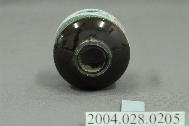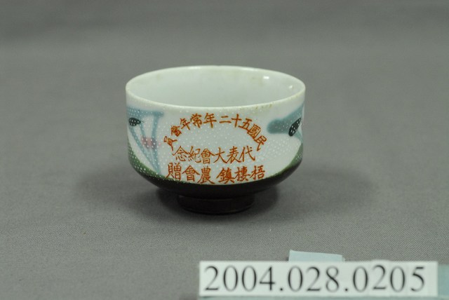 1.本物件為1963年梧棲鎮農會贈小瓷杯,這個杯子大約7.5公分大小,高5.2公分,除了杯子本身之外,並無附有茶杯蓋,杯身上有文字「民國五十二年常年會員 代表大會紀念 梧棲鎮農會贈」,圖樣為杯子底部為黑色,杯身有綠色和藍綠色圖樣,並用白點佈滿整個杯子,整體瓷杯屬於敞口短圈足式。小瓷杯本身保存良好,應有上青釉,因此整體有淡淡青綠色。