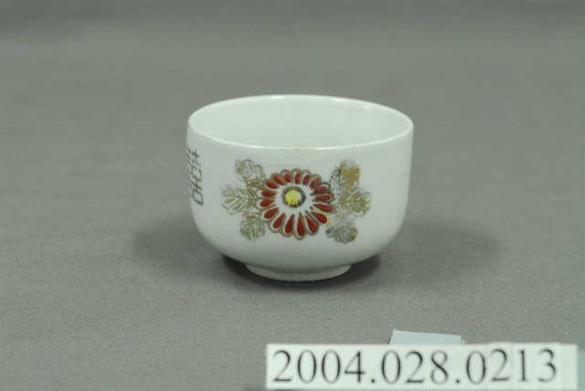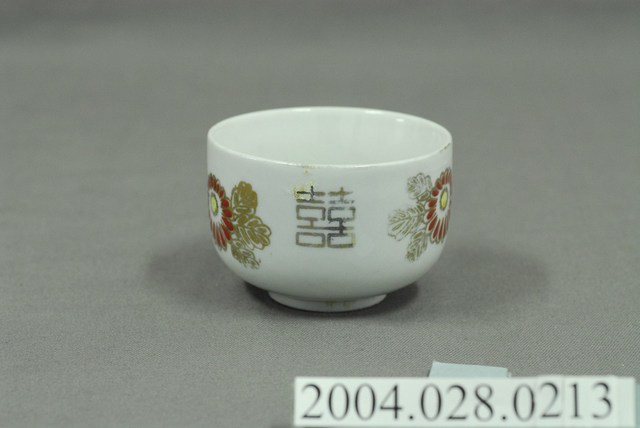1.本物件為囍字小瓷杯,這個杯子大約7.5公分大小,高約5公分,除了杯子本身之外,並無附有茶杯蓋,杯身「囍」字位於中央,兩旁有類似紅色牡丹花之圖案,整體瓷杯屬於敞口短圈足式。小瓷杯本身保存良好,屬白瓷,「囍」字有破損修復痕跡。