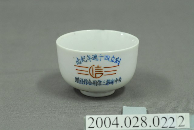 1.本物件為1955年臺中市第三信用合作社贈紀念小瓷杯,這個杯子大約7.5公分大小,高約5.2公分,除了杯子本身之外,並無附有茶杯蓋,杯身正面有藍文字「創立四十週年紀念 台中市第三信用合作社贈」與紅字「信」(應為圖徽),背面則是藍花紅果圖,整體瓷杯屬於敞口短圈足式。小瓷杯本身保存良好,屬白瓷。臺中市第三信用合作社即為今日的三信商業銀行股份有限公司。