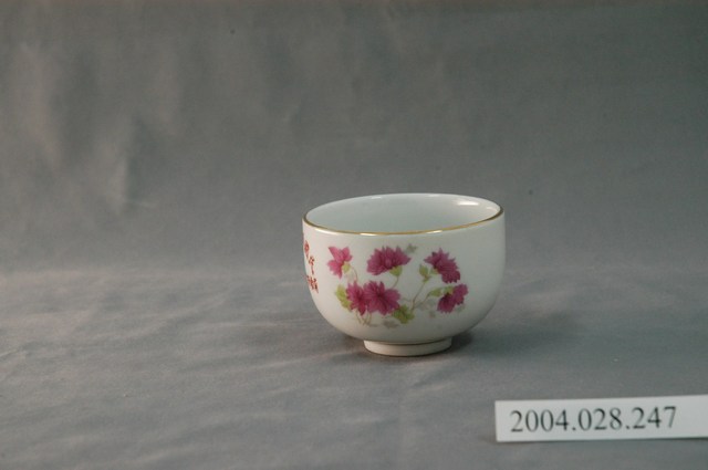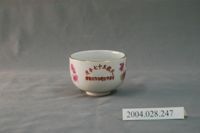 1.本文物為屏東市信用合作社敬贈小瓷杯,高約5.4公分,除了杯子本身之外,並未附有茶杯蓋。杯身上有紅文字「民國五十七年度 屏東市信用合作社敬贈」,除了這些紅字之外,還有一些桃紅色花朵圖案,杯底還有「大同瓷器」等字樣,杯子邊緣有金色線條。整體瓷杯屬於敞口短圈足式。小瓷杯本身保存良好,有些許髒污,屬白瓷。