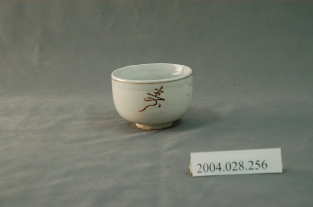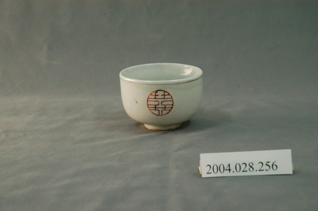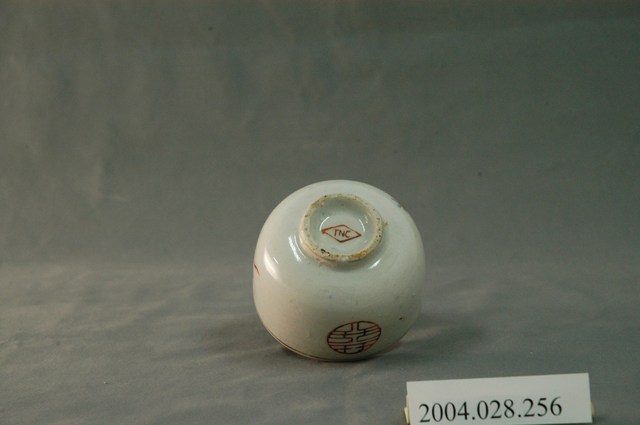 1.本物件為囍壽字小瓷杯,這個杯子大約7.5公分大小,高約5公分,除了杯子本身之外,並無附有茶杯蓋,杯身有「囍」與「壽」字與一朵紅色牡丹花,杯緣有一圈金圈,杯底有「TNC」,整體瓷杯屬於敞口短圈足式。小瓷杯本身保存良好,屬白瓷。
