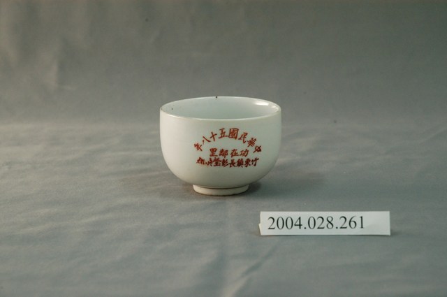 1.本文物為竹東鎮長彭瑩煥贈小瓷杯,這個杯子大約7.5公分大小,高約5.2公分,除了杯子本身之外,並未附有茶杯蓋,杯身有紅文字「中華民國五十八年 功在鄰里 竹東鎮長彭瑩煥贈」,還有大大的「壽」字,一旁有葉草花紋。整體瓷杯屬於敞口短圈足式。小瓷杯本身保存良好,屬白瓷。