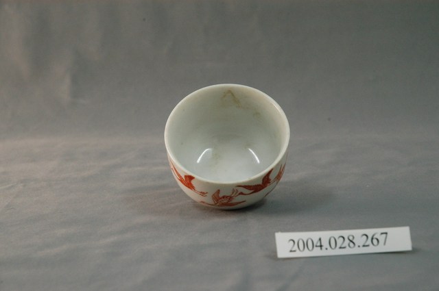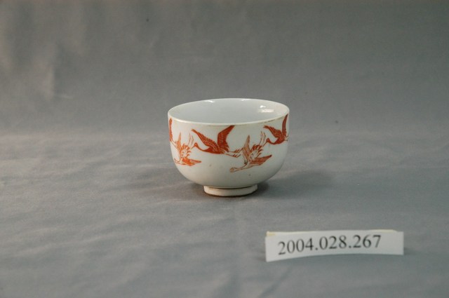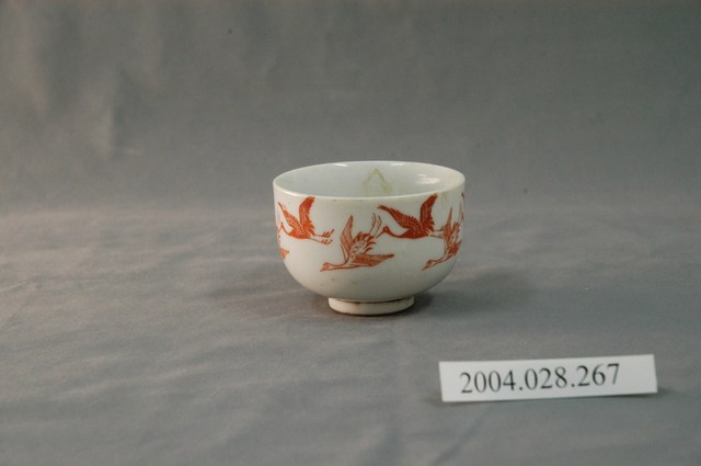 1.本文物為三貴謹製鶴紋小瓷杯,這個杯子大約7.3公分大小,高5.1公分,除了杯子本身之外,並未附有茶杯蓋,杯身上有紅色飛鶴,杯底有文字「三貴謹製」,整體瓷杯屬於敞口短圈足式。小瓷杯本身保存良好,以白瓷為基底,有些微髒污與泛黃。