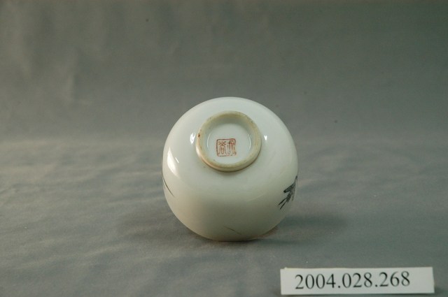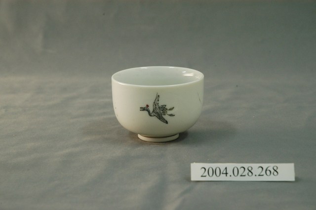 1.本文物為鶴紋小瓷杯,這個杯子大約7.3公分大小,高5公分,除了杯子本身之外,並未附有茶杯蓋,杯身只有飛鶴圖,其中一隻鶴呈橙色。整體瓷杯屬於敞口短圈足式,小瓷杯本身保存良好,以白瓷為基底,有些微髒污與泛黃。