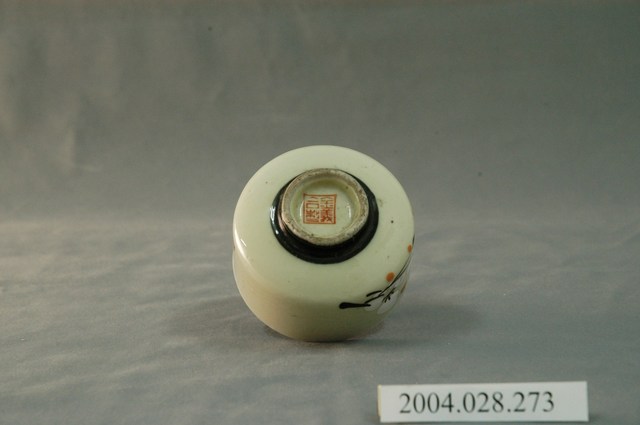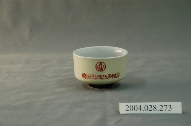 1.本文物為臺北市第九信用合作社敬贈小瓷杯,這個杯子大約7.4公分大小,高4.9公分,除了杯子本身之外,並未附有茶杯蓋,杯身有文字「臺北市第九信用合作社敬贈」,一旁有「九信」徽章,並有白色花瓣圖樣,杯底有一圈黑色為底、文字「金義合製」。整體瓷杯屬於敞口短圈足式,小瓷杯本身保存良好,以白瓷為基底。