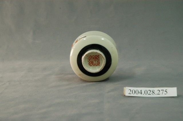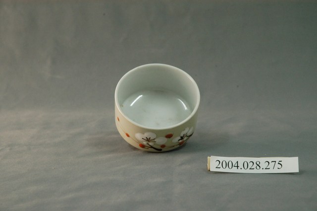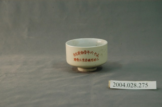 1.本文物為三功煤礦產業工會贈勞動節紀念小瓷杯,這個杯子大約7.3公分大小,高5公分,除了杯子本身之外,並未附有茶杯蓋,杯身有文字「五十六年度勞動節紀念 三功煤礦產業工會贈」,並有白色花瓣圖樣,杯底有黑色一圈、文字「臺北市中一公司」。整體瓷杯屬於敞口短圈足式,小瓷杯本身保存良好,以白瓷為基底。
