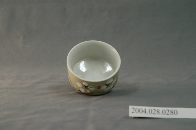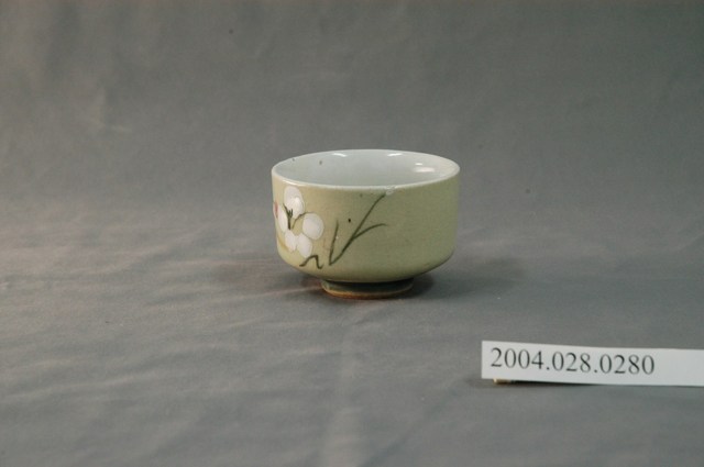 1.本物件為日式花紋小瓷杯,這個杯子大約7.5公分大小,高5公分,除了杯子本身之外,並無附有茶杯蓋,杯身上僅有一些日式花繪,分別為兩朵五瓣白花與一些綠葉、紅點,整體瓷杯屬於敞口短圈足式。小瓷杯本身保存良好,整體有淡淡草綠色調,但瓷杯內部維持白色。