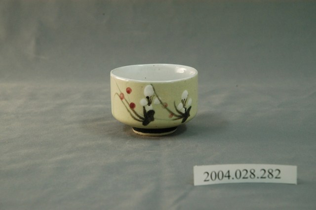1.本物件為日式花紋小瓷杯,這個杯子大約7.5公分大小,高5公分,除了杯子本身之外,並無附有茶杯蓋,杯身上僅有一些日式花繪,分別為兩朵三瓣白花與一些綠葉、紅點,整體瓷杯屬於敞口短圈足式。小瓷杯本身保存良好,整體有淡淡草綠色調,但瓷杯內部維持白色,杯底圍繞足部有一墨綠色。
