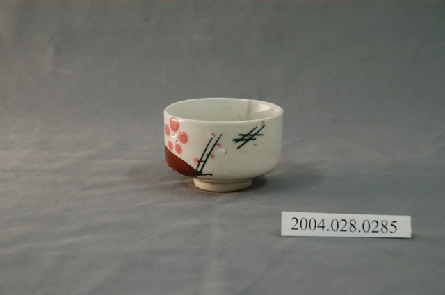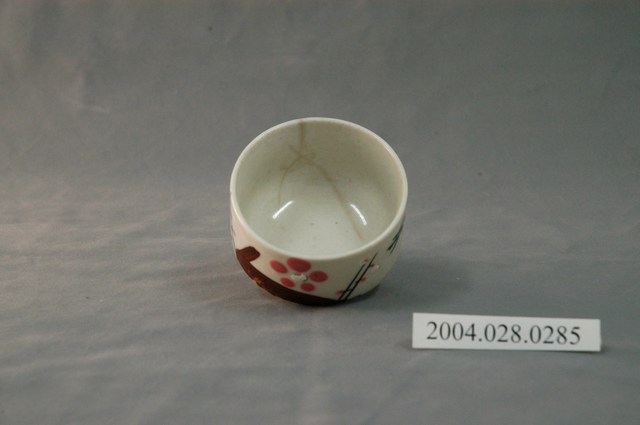 1.本物件為日式花紋小瓷杯,這個杯子大約7.5公分大小,高5公分,除了杯子本身之外,並無附有茶杯蓋,杯身上有類似梅花之圖案,分別為一朵五瓣紅花與一些綠葉、小粉花、木條,整體瓷杯屬於敞口短圈足式。小瓷杯本身保存良好,整體有淡淡草綠色調,但瓷杯內部維持白色。