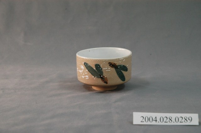 1.本文物為三峽鎮長王德火贈教師節紀念小瓷杯,這個杯子大約7.7公分大小,高5.1公分,除了杯子本身之外,並未附有茶杯蓋,杯身有紅文字「民國五十三年教師節紀念 尊師重道 三峽鎮長王德火贈」,並有綠葉圖樣,杯身以橙色為底,附有白點佈滿全杯。整體瓷杯屬於敞口短圈足式,小瓷杯本身保存良好,以白瓷為基底,有些微髒污。