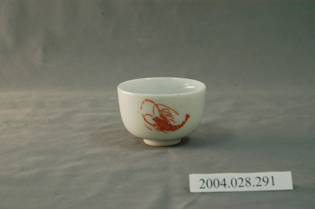 1.本物件為日式花紋小瓷杯,這個杯子大約7.3公分大小,高約4.8公分,除了杯子本身之外,並無附有茶杯蓋,杯身上僅有一些紋繪,這個紋繪主要以龍蝦當作繪製重點,整體瓷杯屬於敞口短圈足式。小瓷杯本身保存良好,以白瓷為基底,杯底還有「陶□」兩字。