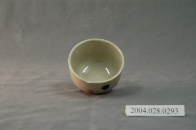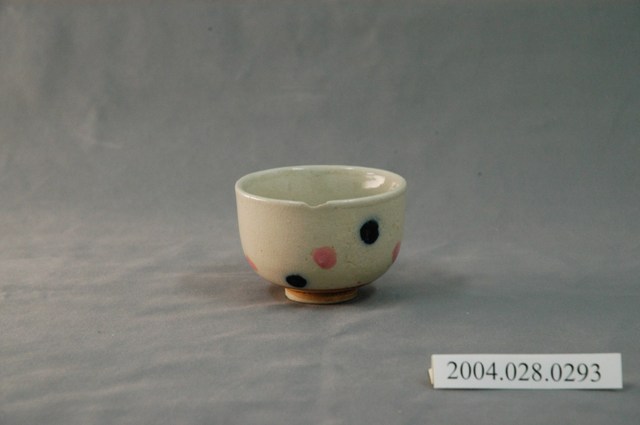 1.本物件為日式花紋小瓷杯,這個杯子大約7.6公分大小,高約5.5公分,除了杯子本身之外,並無附有茶杯蓋,杯身上僅有一些紋繪,這個紋繪主要以藍、粉紅斑點為繪製重點,整體瓷杯屬於敞口短圈足式。小瓷杯本身保存良好,杯身為淡淡棕色,杯緣有小缺口。