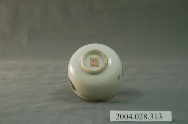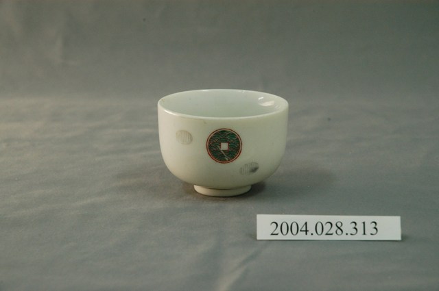 1.本物件為日式小瓷杯,這個杯子大約7.5公分大小,高約5公分,除了杯子本身之外,並無附有茶杯蓋,杯身主體為古錢紋,杯底有「丸□謹製」,整體瓷杯屬於敞口短圈足式。小瓷杯本身保存良好,屬白瓷。