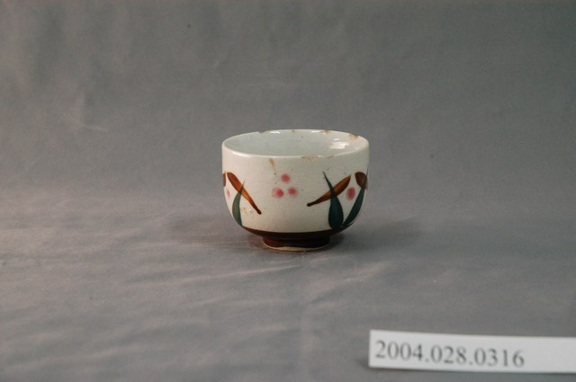 1.本物件為日式小瓷杯,這個杯子大約7.5公分大小,高約5公分,除了杯子本身之外,並無附有茶杯蓋,杯身主體紅花與綠葉,杯底以咖啡色為底,整體瓷杯屬於敞口短圈足式。小瓷杯本身保存良好,屬白瓷,但有些微缺損。