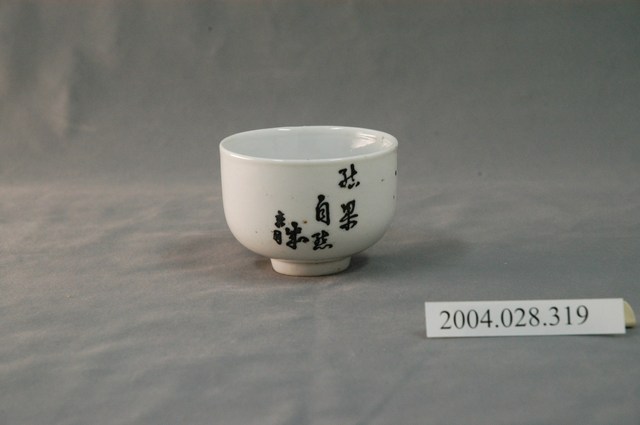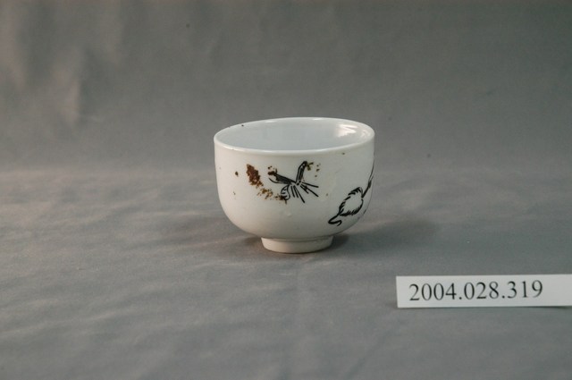 1.本文物為孔果自然小瓷杯,這個杯子大約7.5公分大小,高約5公分,除了杯子本身之外,並未附有茶杯蓋,杯身主要有文字「孔果自然□□□」,一旁則有相關意境圖像,像是拿著蒲扇趕蚊子的紅衣和尚。整體瓷杯屬於敞口短圈足式。小瓷杯本身保存良好,屬白瓷。